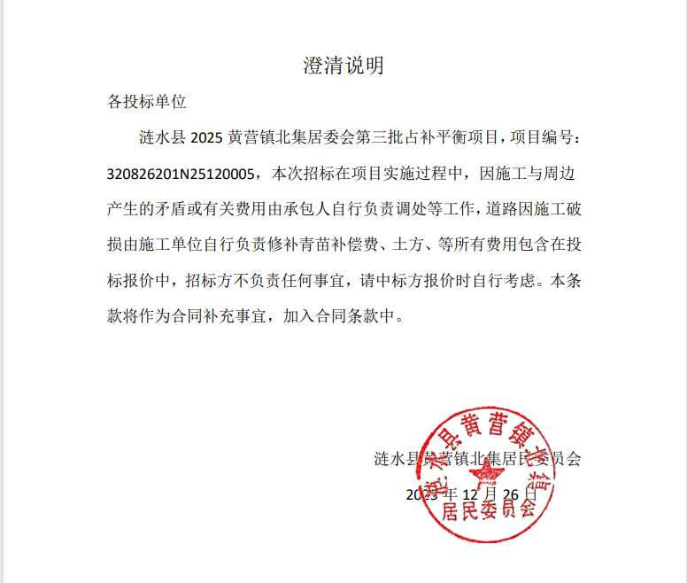 涟水县2025 黄营镇北集居委会第三批占补平衡项目,项目编号: 320826201N25120005,本次招标在项目实施过程中,因施工与周边产生的矛盾或有关费用由承包人自行负责调处等工作,道路因施工破损由施工单位自行负责修补青苗补偿费、土方、等所有费用包含在投标报价中,招标方不负责任何事宜,请中标方报价时自行考虑。本条款将作为合同补充事宜,加入合同条款中。